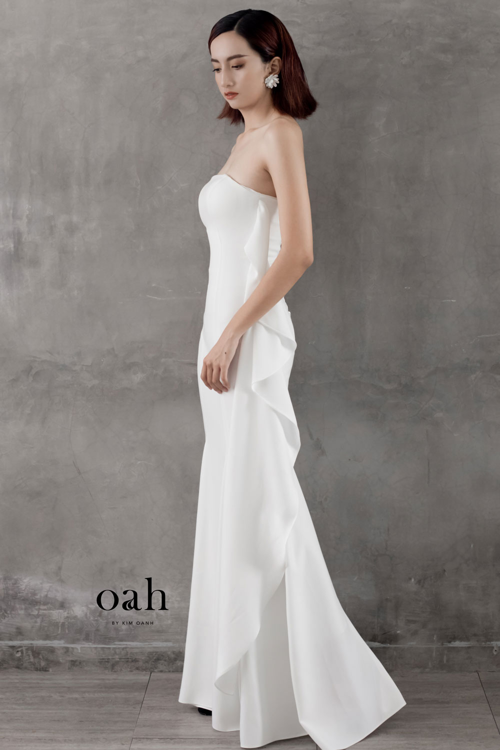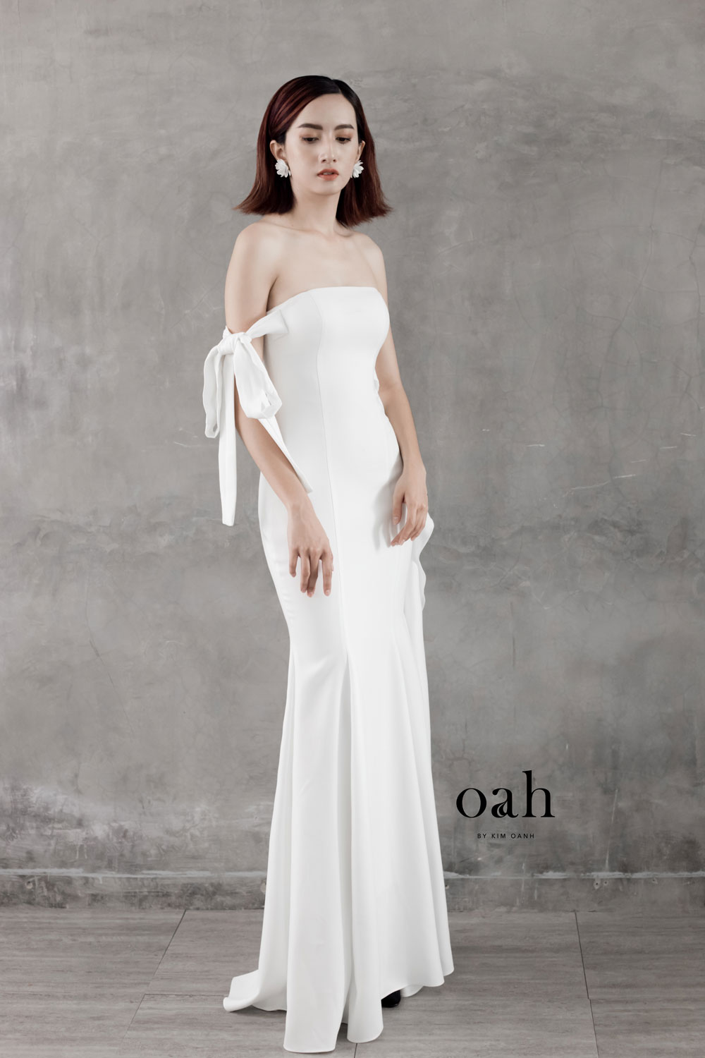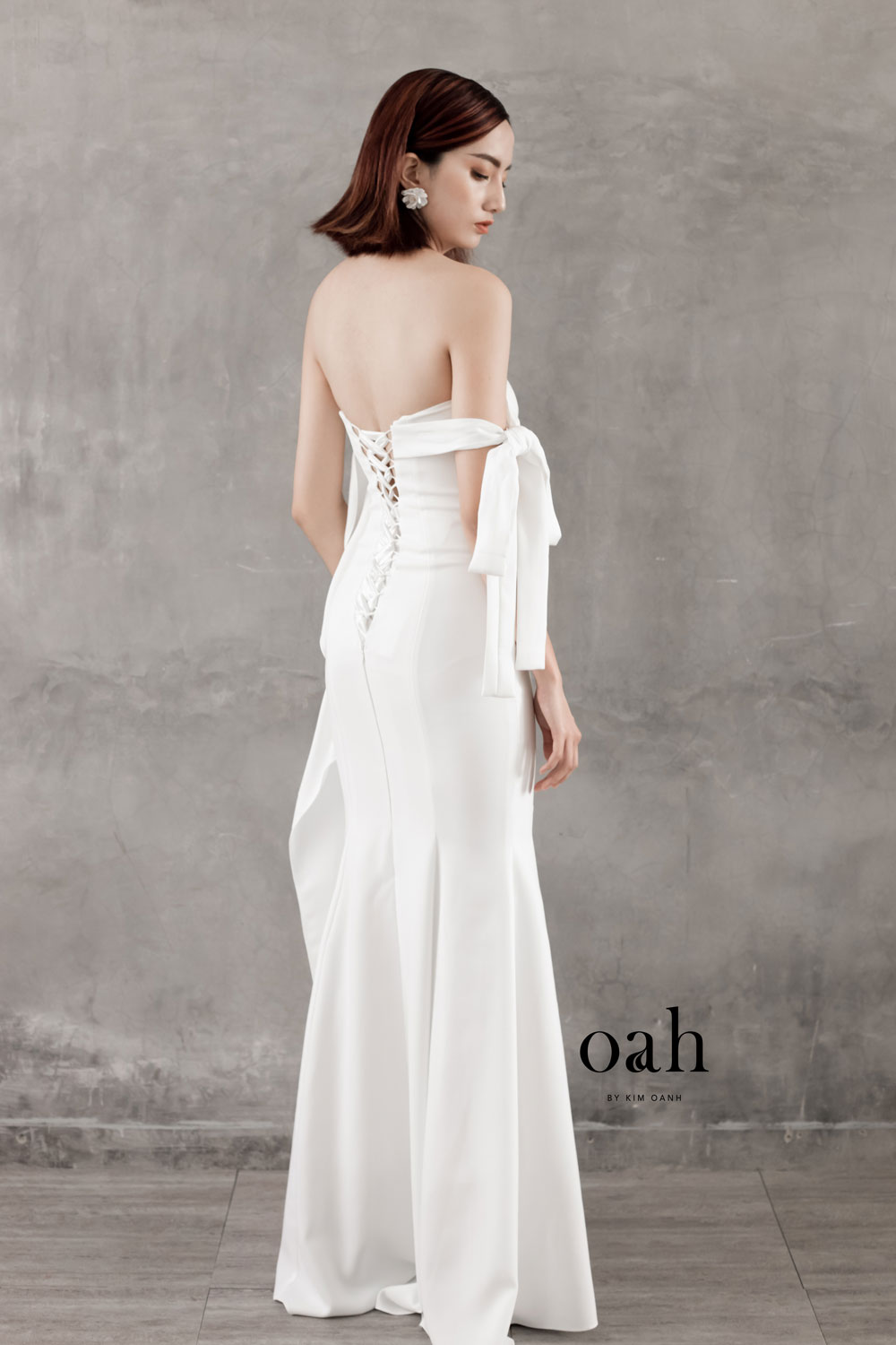 [OanhDesign] Váy cưới đuôi cá tối giản – Gloria OAH032 do Oanh Design thiết kế và hoàn thiện. Chiếc áo cưới đuôi cá giúp bạn khéo léo khoe trọn những đường cong quyến rũ của cơ thể. Chiếc váy cưới minimalist – váy cưới tối giản bỏ qua tất cả những chi tiết rườm rà, tập trung vào việc tôn dáng cho cô dâu. Điểm nhấn của chiếc váy chính là tay cột rớt vai, phần lưng dùng thiết kế dây đan và tà áo vây cá phối nhẹ nhàng.