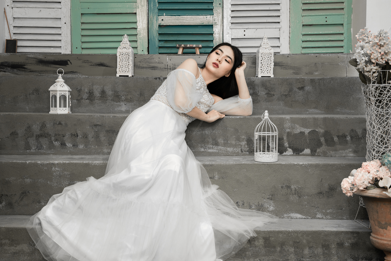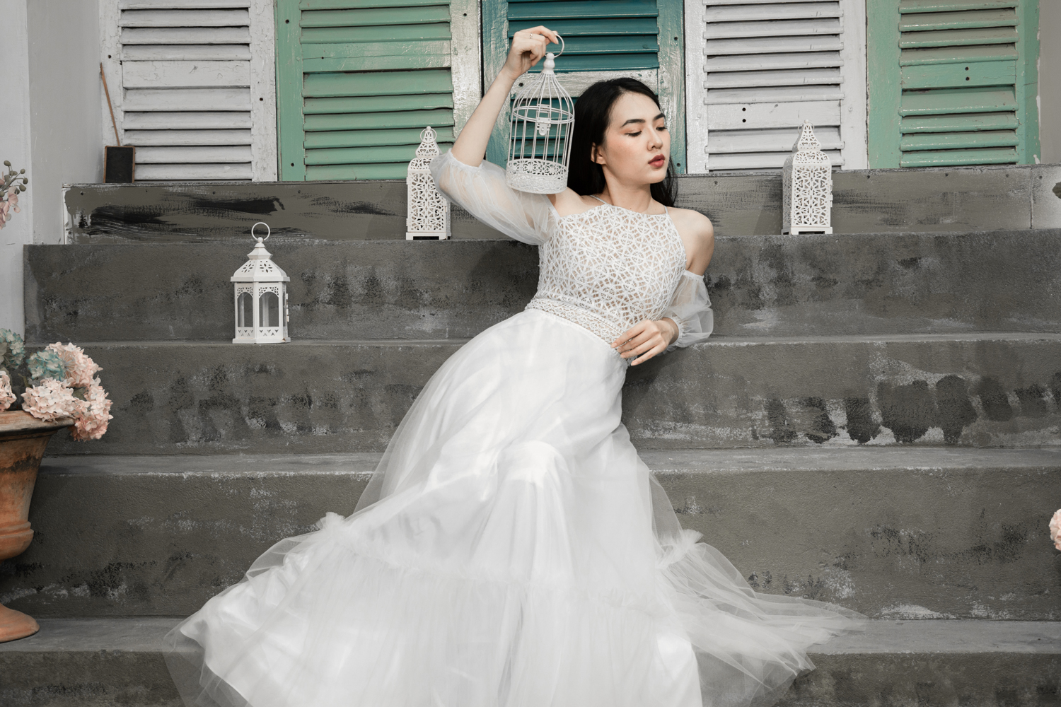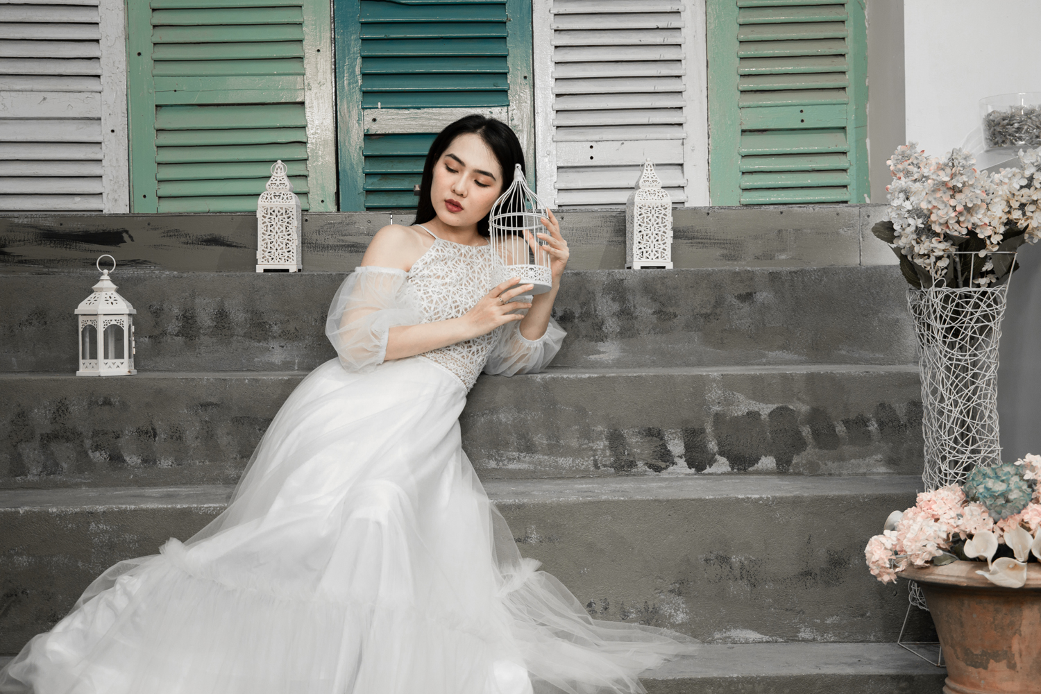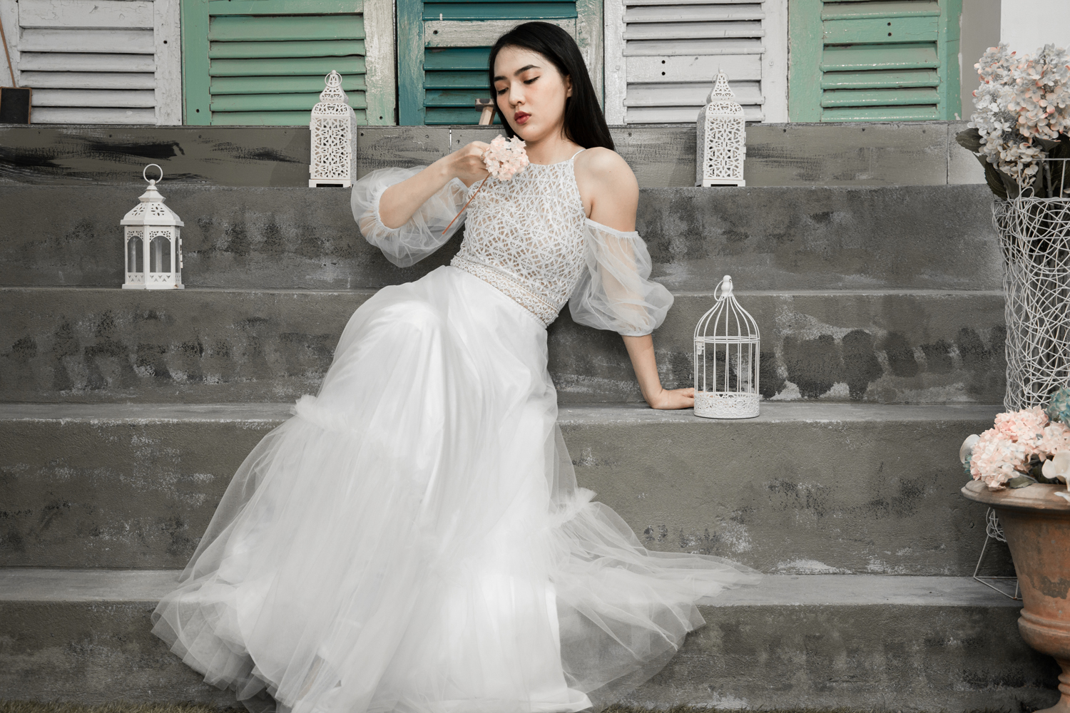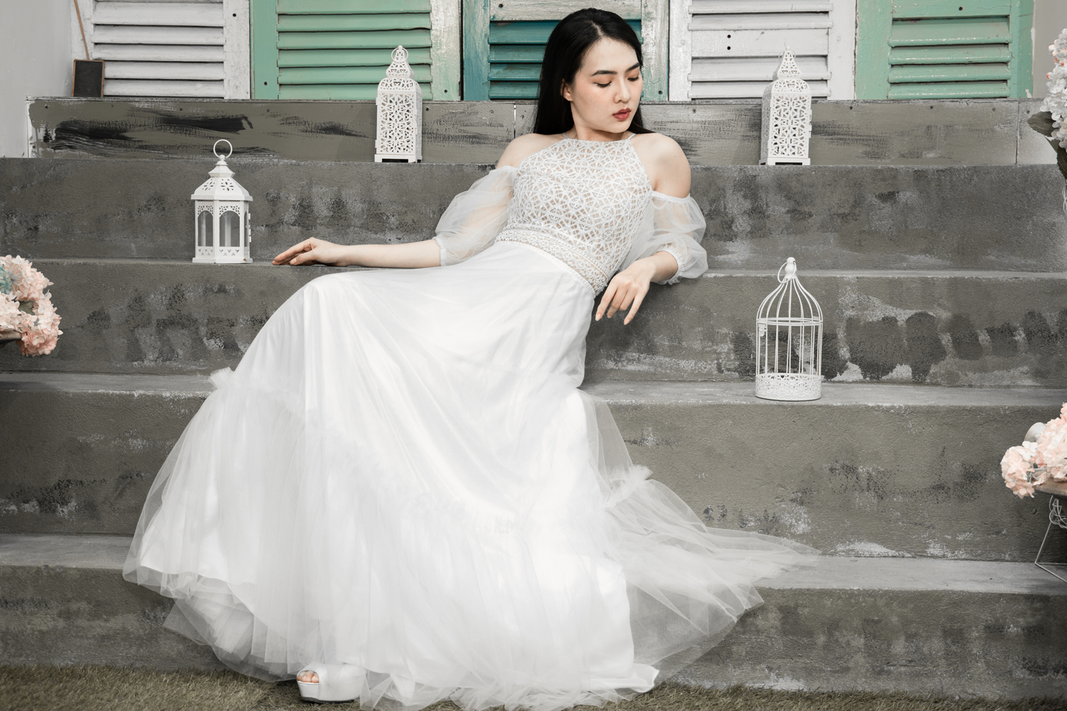 Váy cưới cổ yếm trắng – Chloe do NTK Kim Oanh sáng tạo. Chiếc váy cưới xinh đẹp với thiết kế cổ yếm, tay phồng rớt vai và chân váy phân tầng, vừa cao quý, vừa đáng yêu trong trẻo.