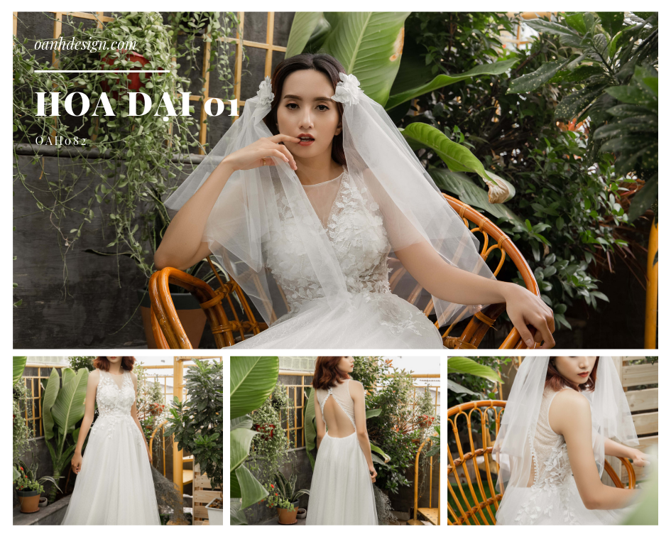 Váy cưới dễ thương HOA DẠI 01 – OAH082. Lấy ý tưởng từ những loài hoa dại, từ nét đẹp và sức sống của chúng, chiếc váy cưới hoa đơn giản này đã ra đời. Sử dụng chất liệu ren hoa thay vì ren lưới, phối hoa và đá ở ngực áo rớt xuống tùng váy, cùng với thiết kế đắp chéo ngực tạo ra một cảm giác mỹ quan vô cùng thuận mắt. Phần lưng áo khoét cách điệu khoe trọn rãnh lưng sâu.