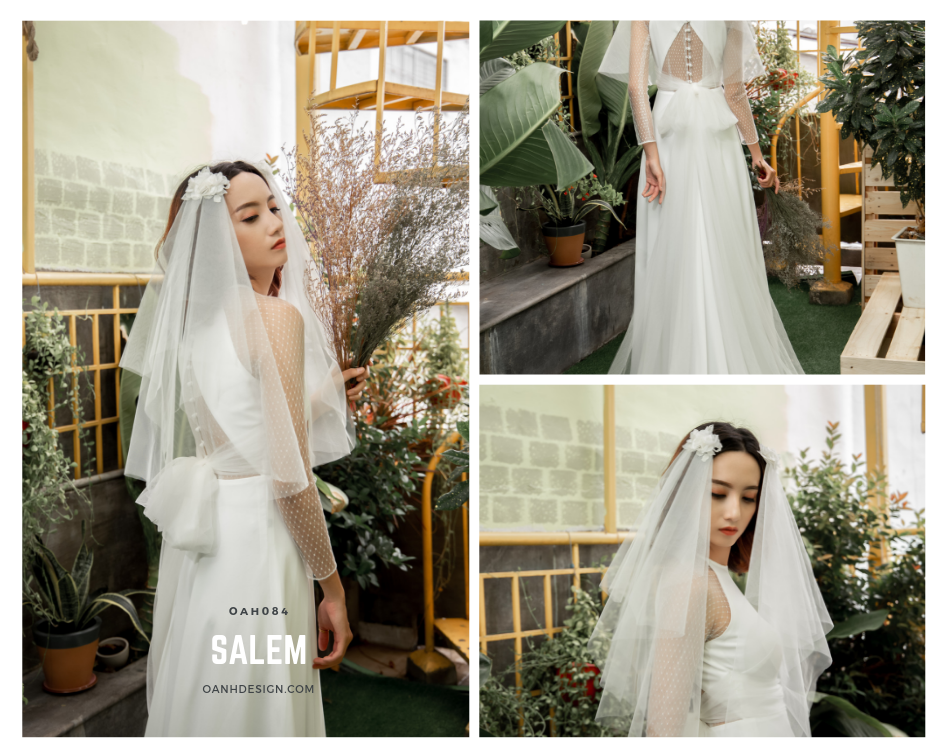 Váy cưới trắng đơn giản SALEM – OAH084. Vẫn theo phong cách đơn giản mà thanh lịch, chiếc váy cưới lấy hoa salem làm chủ đề này vừa gọn nhẹ vừa đầy điểm nhấn. Tay áo ren chấm bi phối cùng thân áo cổ yếm giúp phần thân trên thanh mảnh gọn gàng hơn. Điểm nhấn của thiết kế này chính là phần lưng áo cách điệu lạ mắt, với những đường cắt phóng khoáng phối nơ ren cột ở phần eo.