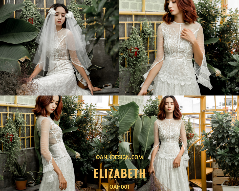 Váy cưới tiểu thư – Elizabeth. Váy cưới đơn giản được cách điệu theo phong cách tiểu thư Pháp, với các phần ren ốp tinh tế ở tay và chân váy thanh lịch. Các chi tiết váy vừa đủ, không cầu kỳ nhưng vô cùng bắt mắt.