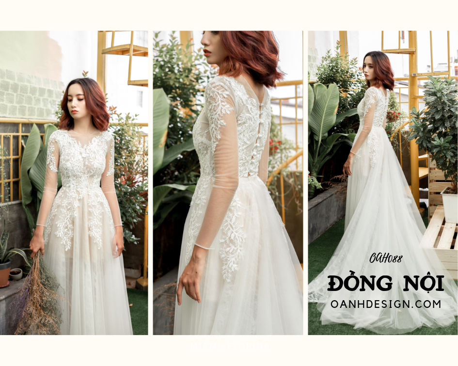 Váy cưới hoa ĐỒNG NỘI – OAH088. Thiết kế bồng bềnh kết hoa này thích hợp với những cô nàng bay bổng, muốn hóa thân thành một nàng công chúa. Với thiết kế tay dài ôm sát, cổ thuyền, lưng xẻ V cạn phối nút và phần váy phồng nhẹ sẽ giúp các cô dâu che được khuyết điểm, vừa nổi bật tinh tế.