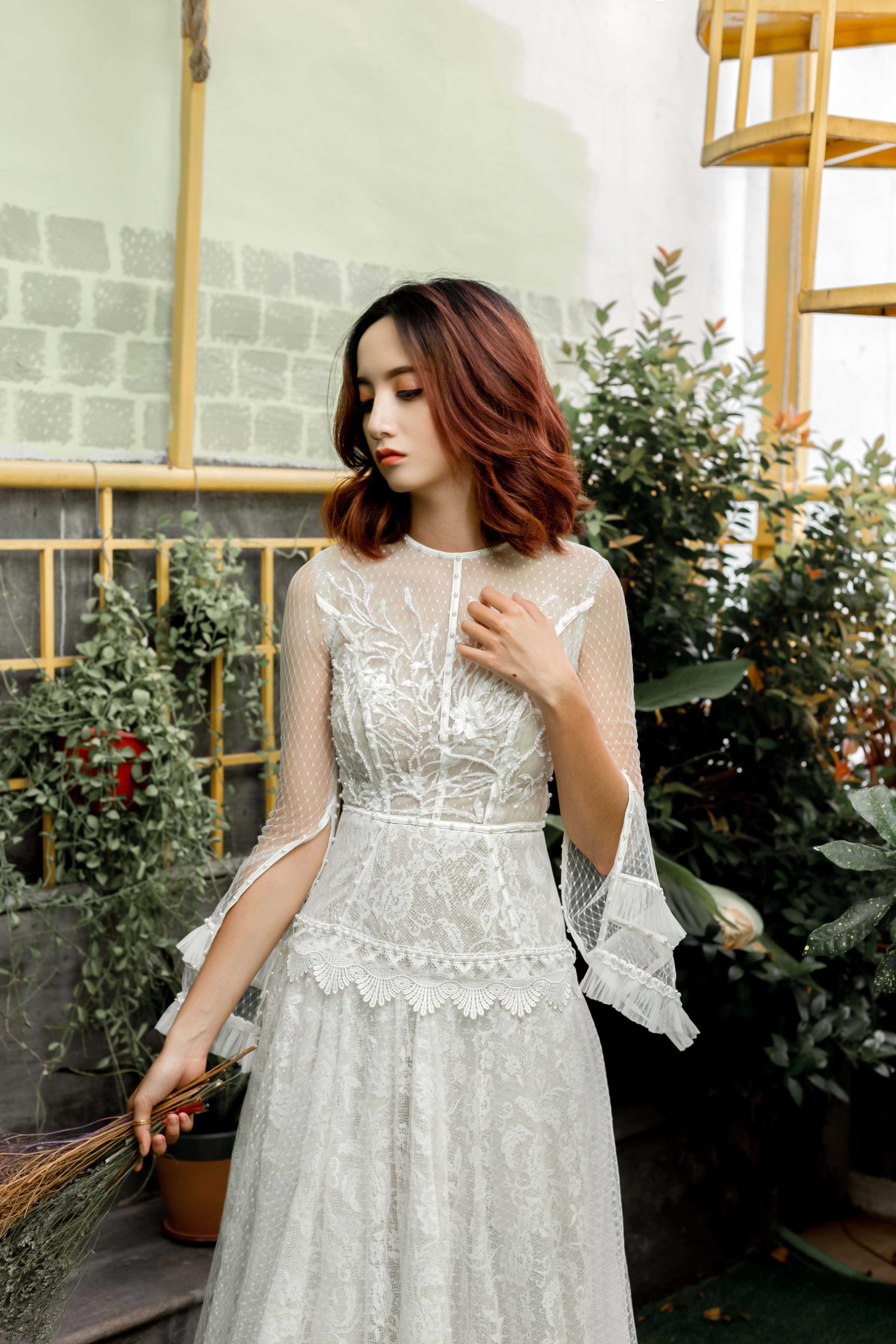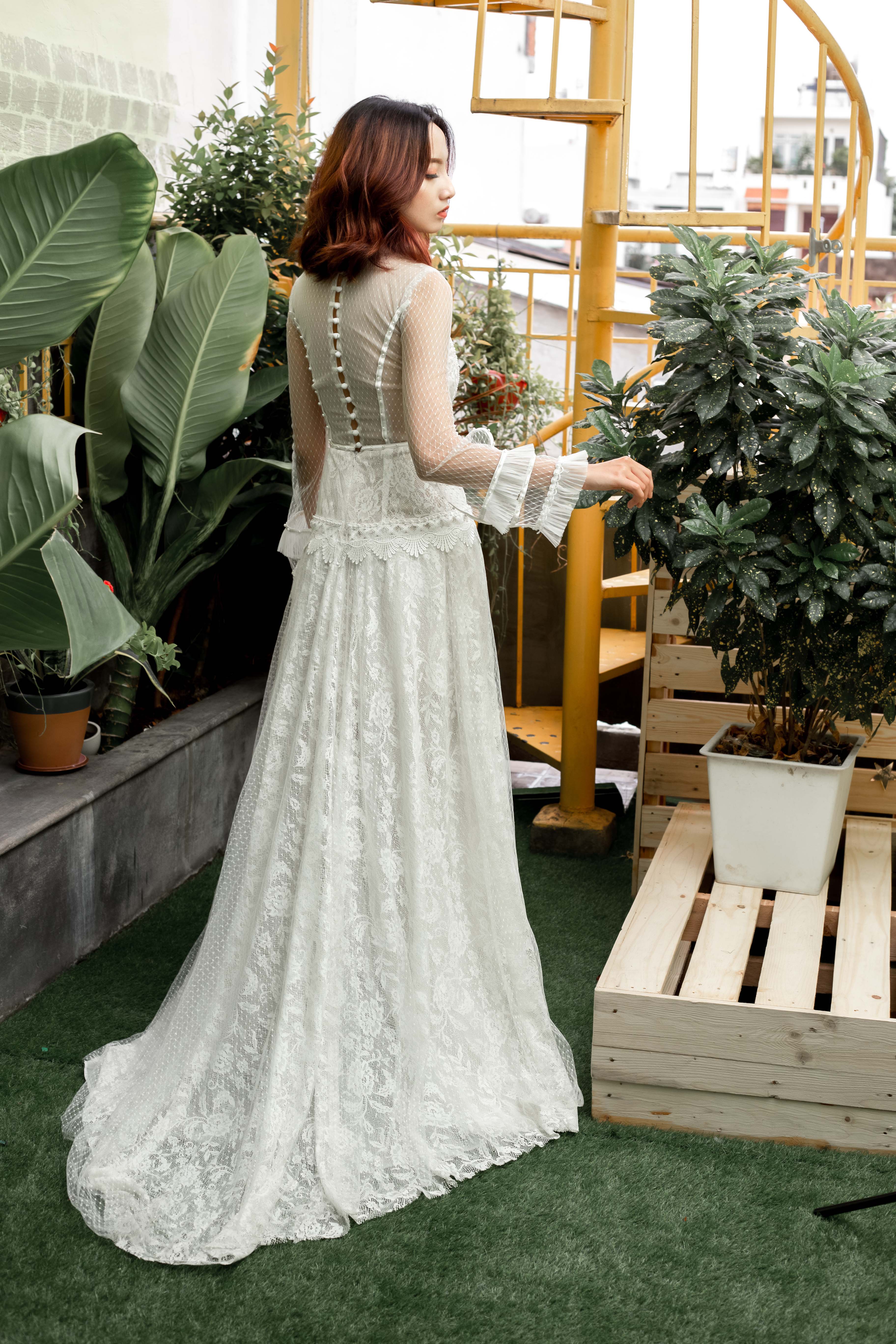 [Oanh Design] Váy cưới tiểu thư – Elizabeth do chính tay NTK Kim Oanh sáng tạo. Váy cưới đơn giản được cách điệu theo phong cách tiểu thư Pháp, với các phần ren ốp tinh tế ở tay và chân váy thanh lịch. Các chi tiết váy vừa đủ, không cầu kỳ nhưng vô cùng bắt mắt.