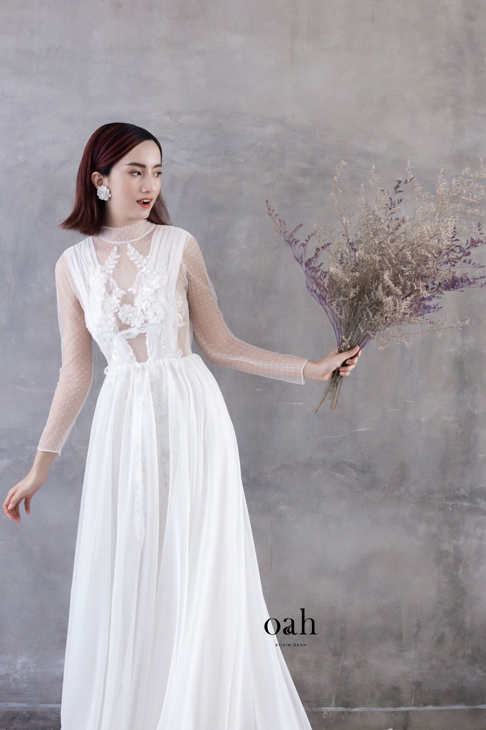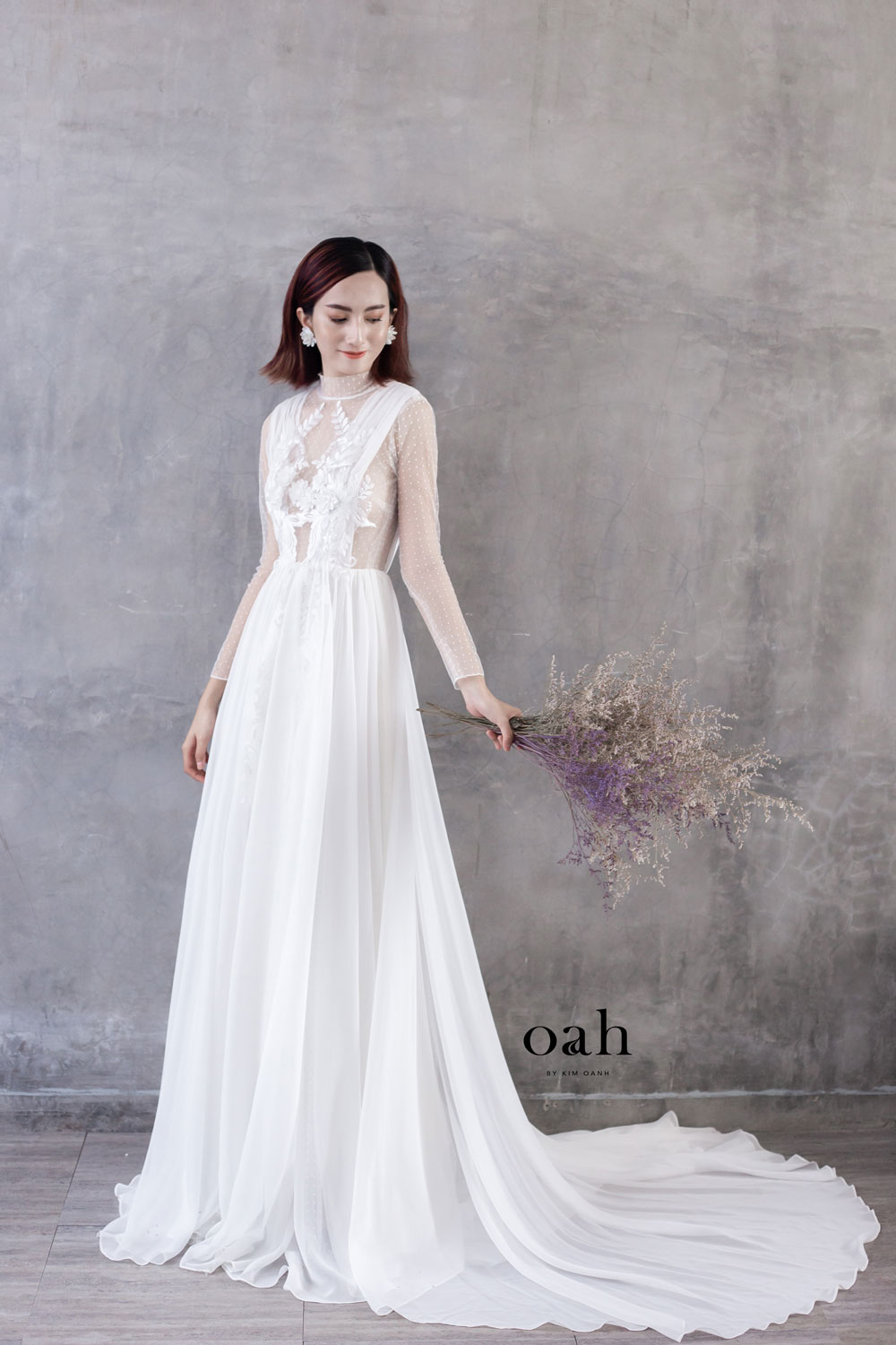 [Oanh Design] Váy cưới ren trắng tay dài – Fleur do NTK Kim Oanh sáng tạo. Với thiết kế cổ lọ, tay dài kín đáo, tưởng chừng ngột ngạt nặng nề, nhưng thật ra lại vô cùng nhẹ nhàng thanh thoát.