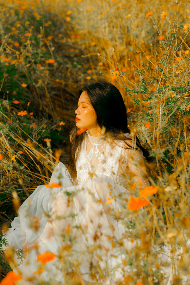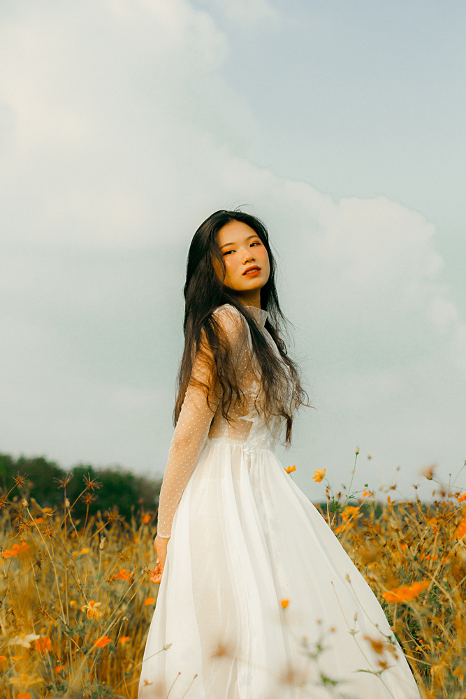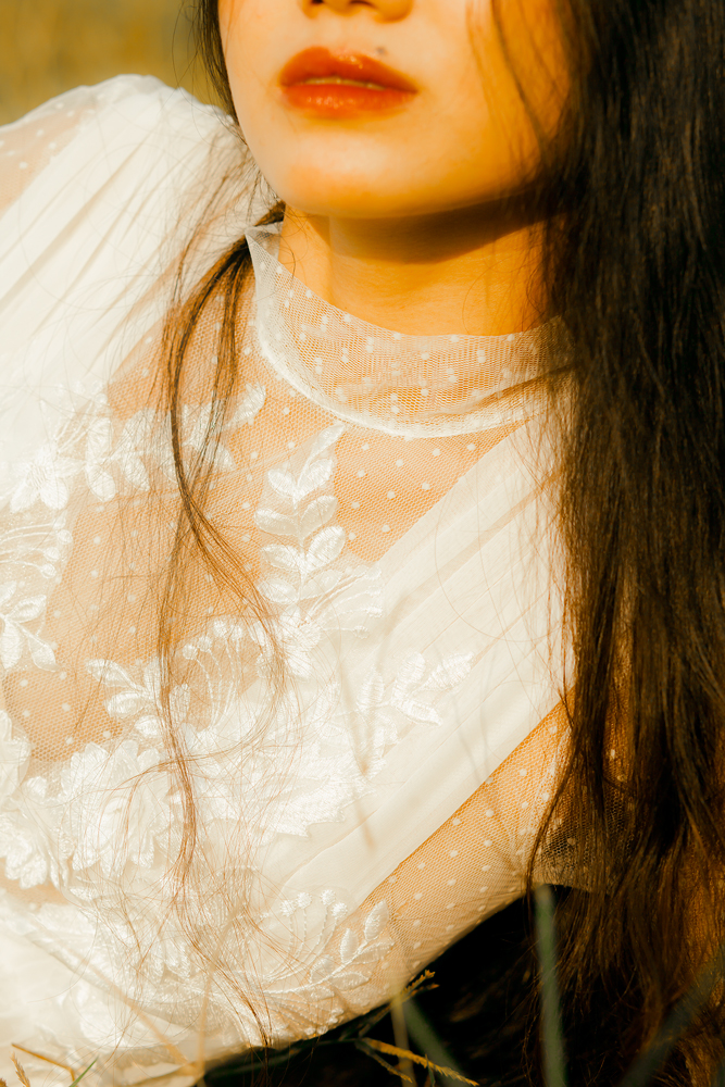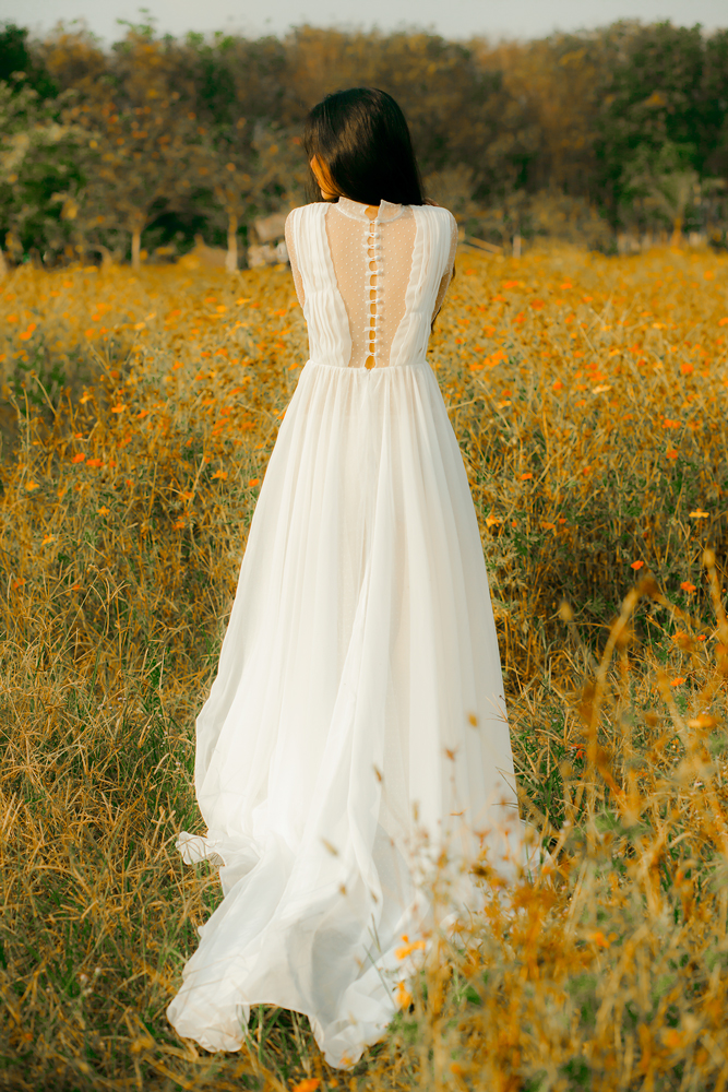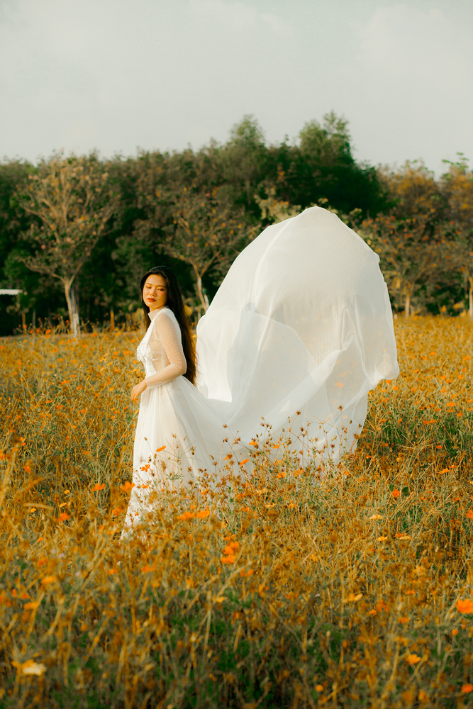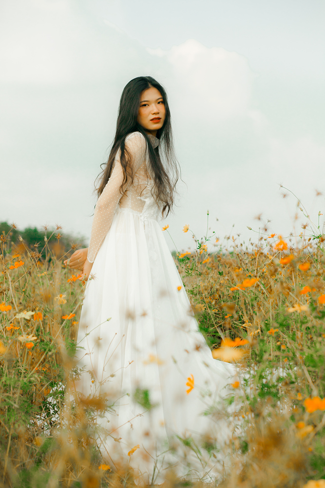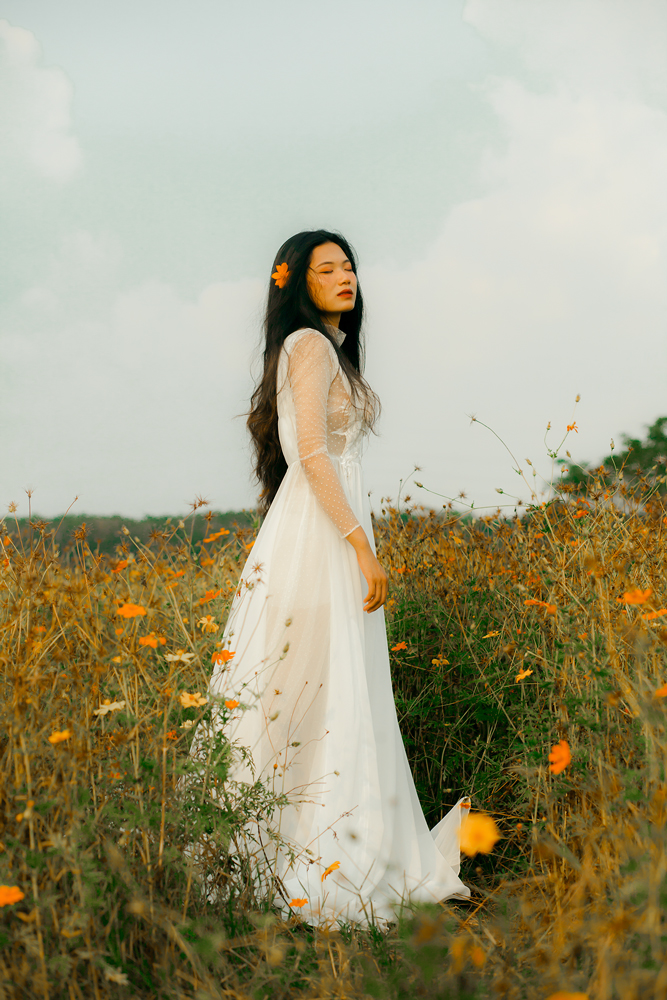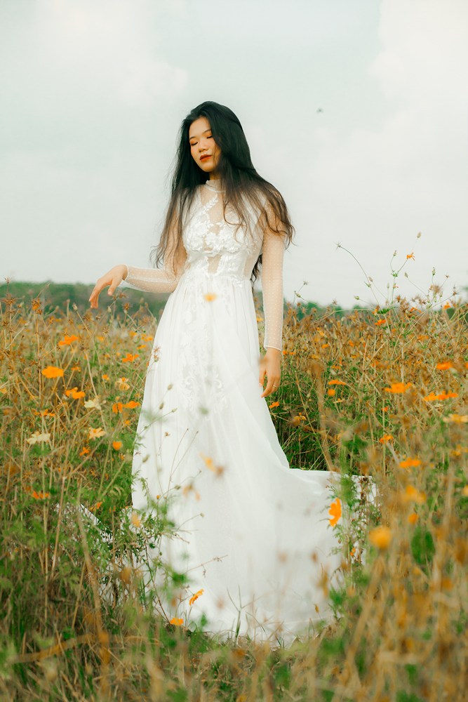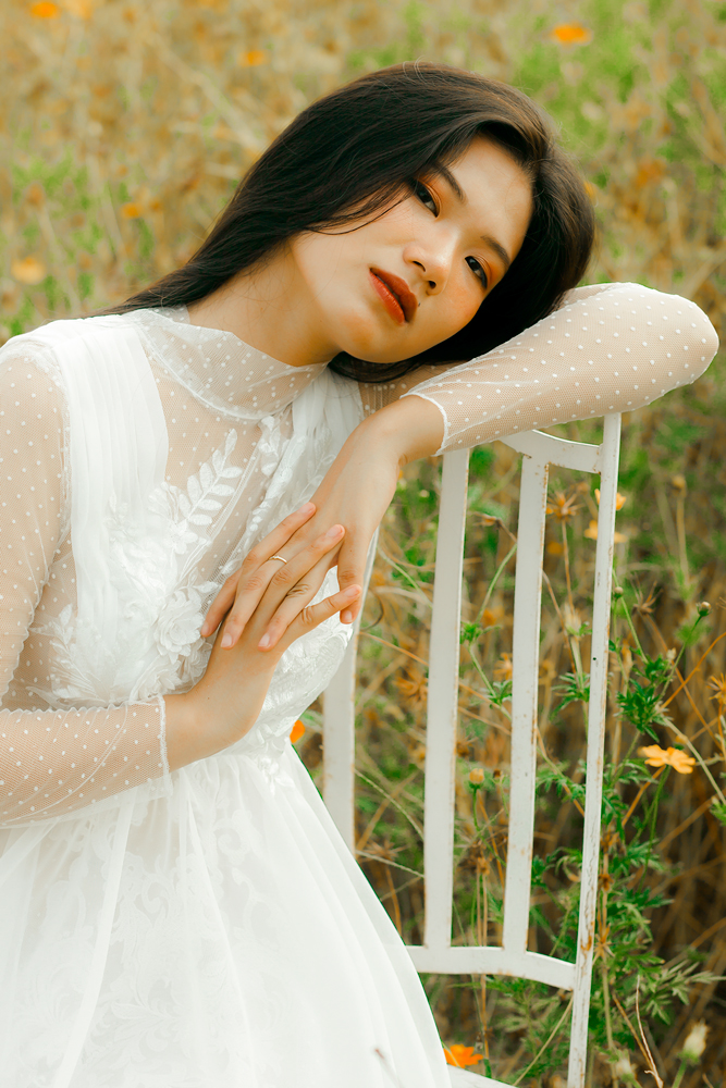 Váy cưới ren trắng tay dài – Fleur do NTK Kim Oanh sáng tạo. Với thiết kế cổ lọ, tay dài kín đáo, tưởng chừng ngột ngạt nặng nề, nhưng thật ra lại vô cùng nhẹ nhàng thanh thoát.