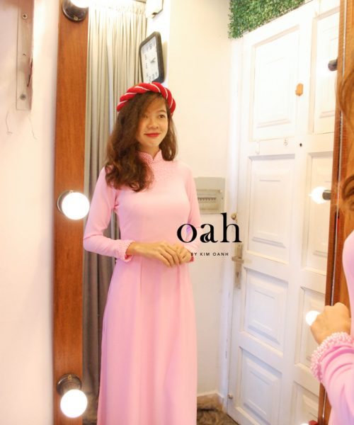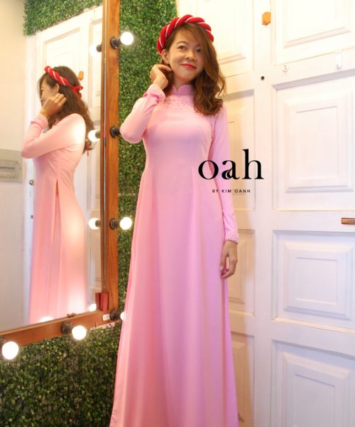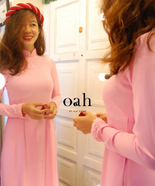[Oanh Design] Áo dài cưới hồng trơn đính ngọc trai – ADC08 do Oanh Design thiết kế. Màu hồng dịu dàng nữ tính, may theo kiểu đơn giản, đính ngọc trai cổ tay và cổ áo.