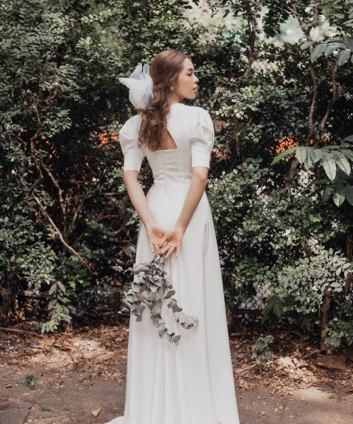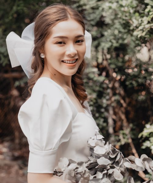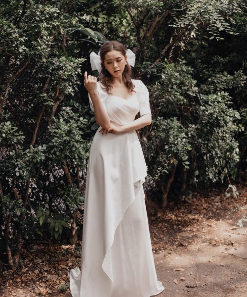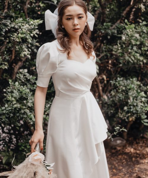 Váy thiết kế hai tùng cut giúp dâu trông cao và thanh thoát hơn.