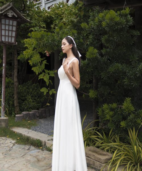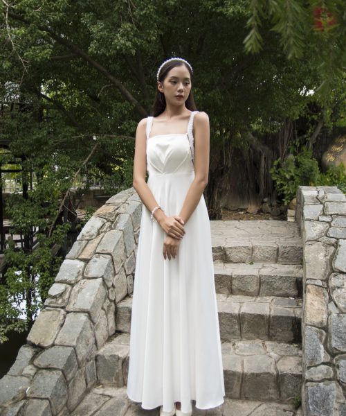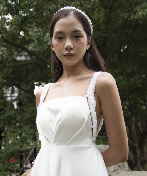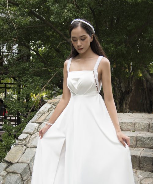 Mẫu váy cưới thiết kế Pearly Dress từ Oah được làm từ chất liệu lụa cao cấp, đính hạt trai thủ công phủ hai dây làm điểm nhấn. Váy nhẹ nhàng, đơn giản nhưng vẫn khác biệt. Sẽ thật lãng mạn nếu nàng mặc nó trên bữa tiệc bãi biển hoặc ngoài trời.