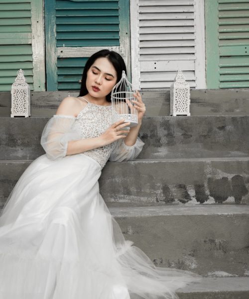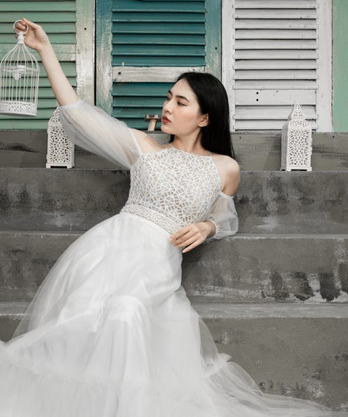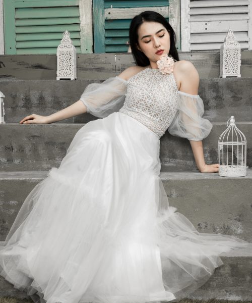 | Đặc điểm | – Cổ yếm – thân áo may bằng ren lưới họa tiết đặc biệt – Tay áo phồng rớt vai – Chân váy phồng nhẹ |