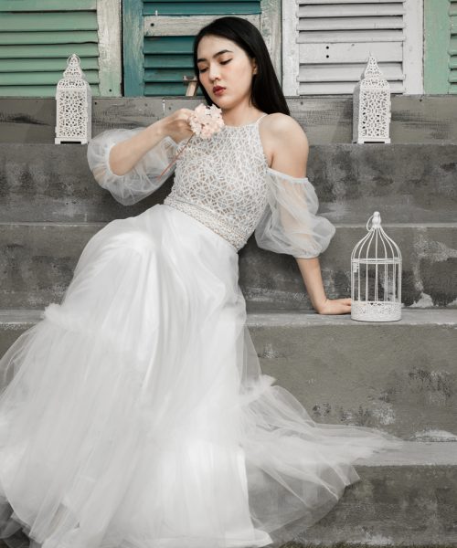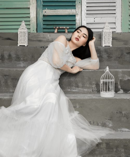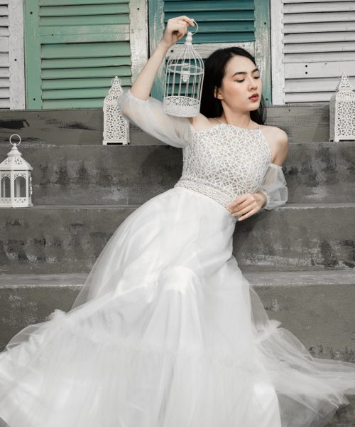 [Oanh Design] Váy cưới cổ yếm trắng – Chloe do NTK Kim Oanh sáng tạo. Chiếc váy cưới xinh đẹp với thiết kế cổ yếm, tay phồng rớt vai và chân váy phân tầng, vừa cao quý, vừa đáng yêu trong trẻo.