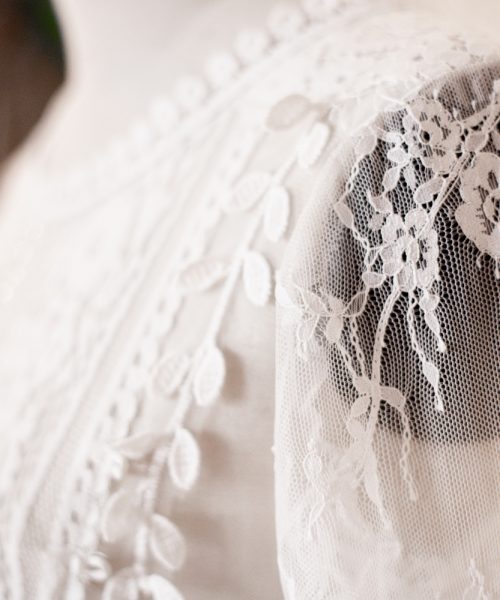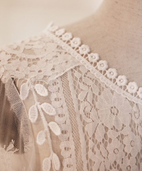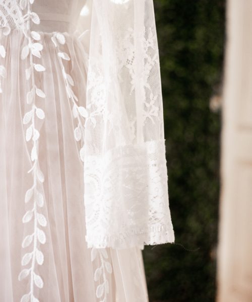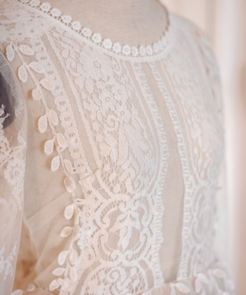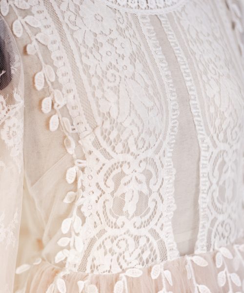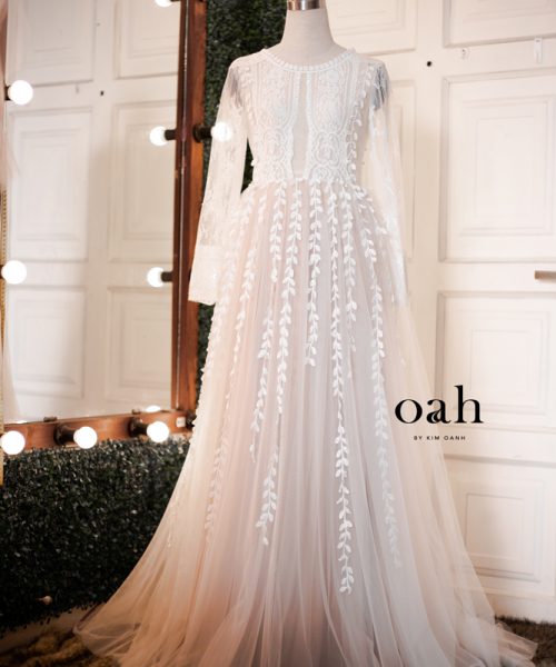 [Oanh Design] Váy cưới ren hoa nude – Tina do Oanh Design thiết kế. Điểm nhấn của chiếc váy cưới này chính là cách phối ren hoa ở phần ngực áo 2 cánh tay và chân váy.