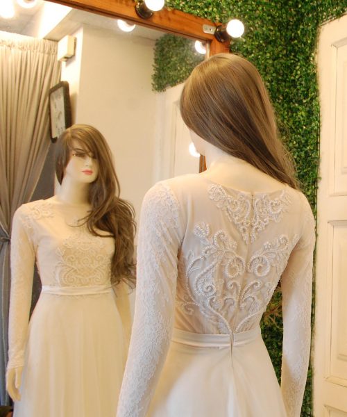 [Oanh Design] Váy cưới tiểu thư – Elizabeth 03 do chính tay NTK Kim Oanh sáng tạo. Mẫu váy cưới đơn giản thanh lịch Elizabeth 03 giữ lại lối cách điệu theo phong cách tiểu thư pháp như mẫu Váy cưới tiểu thư – Elizabeth 01 và Váy cưới tiểu thư – Elizabeth 02 , với các phần ren ốp tinh tế ở tay và ngực. Dáng váy 03 theo dáng váy xuông, sử dụng phần ren khác biệt so với 2 mẫu trước, dù kín đáo nhưng vẫn rất cuốn hút với các điểm phối ren đặc biệt