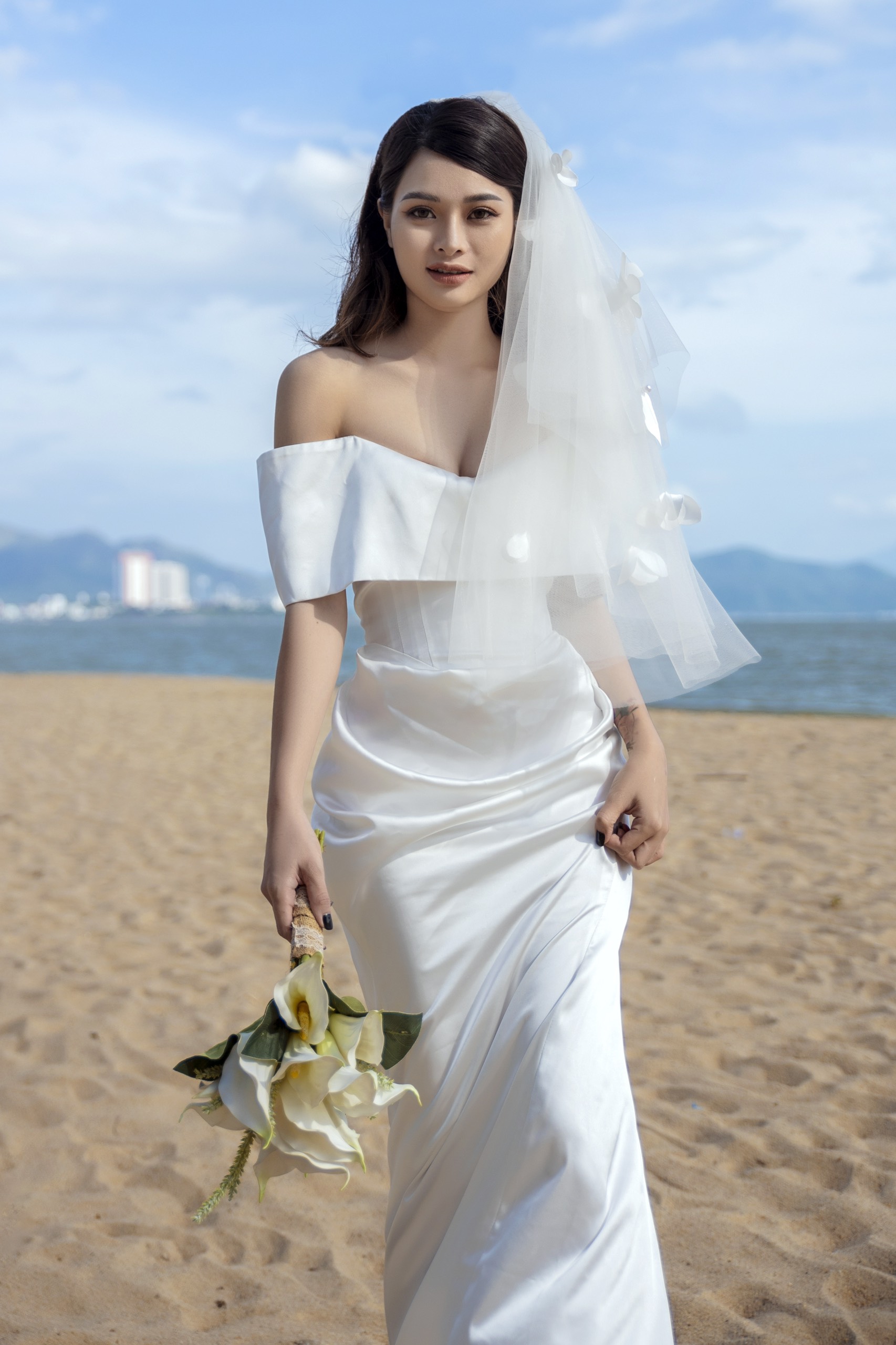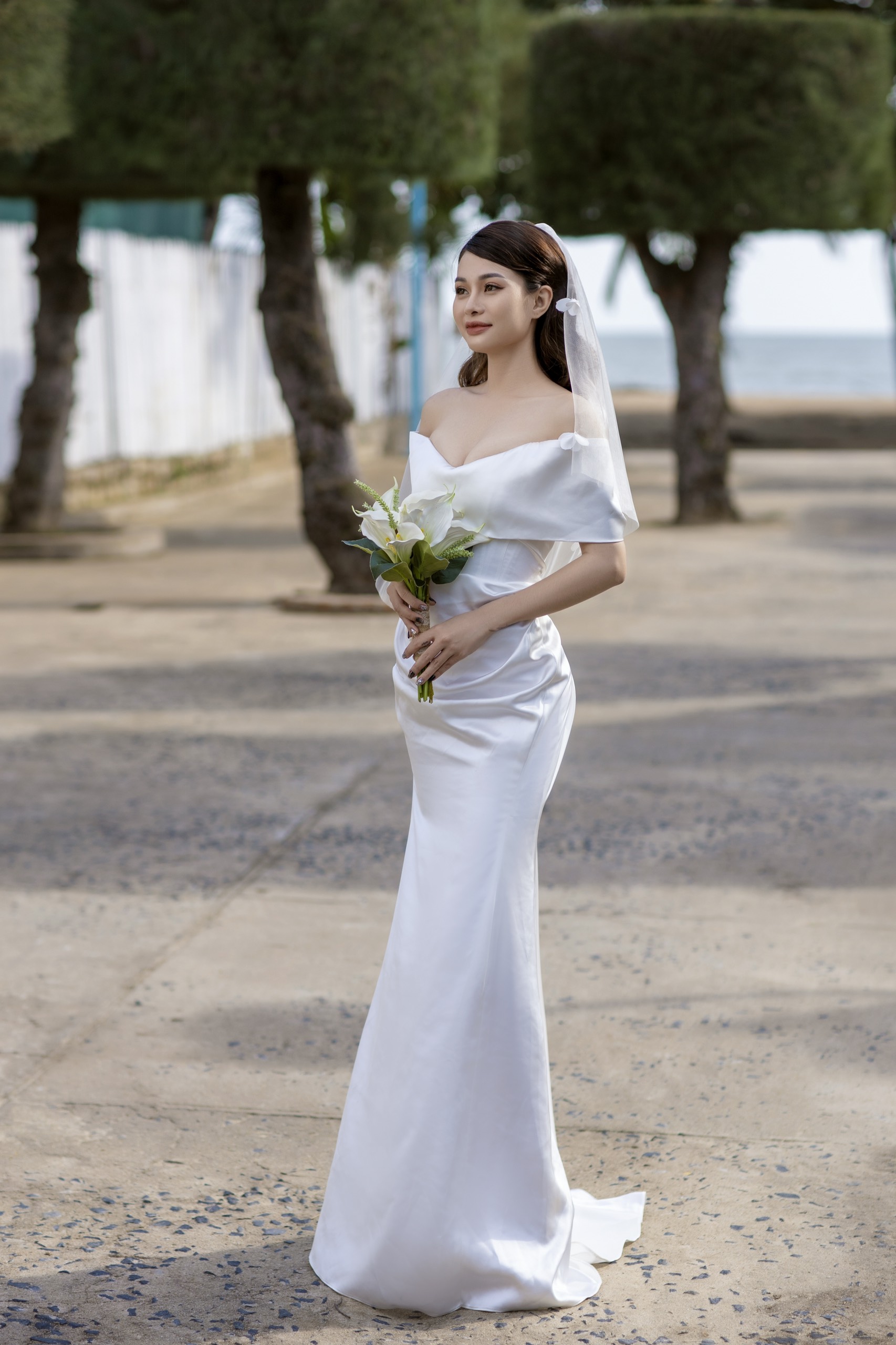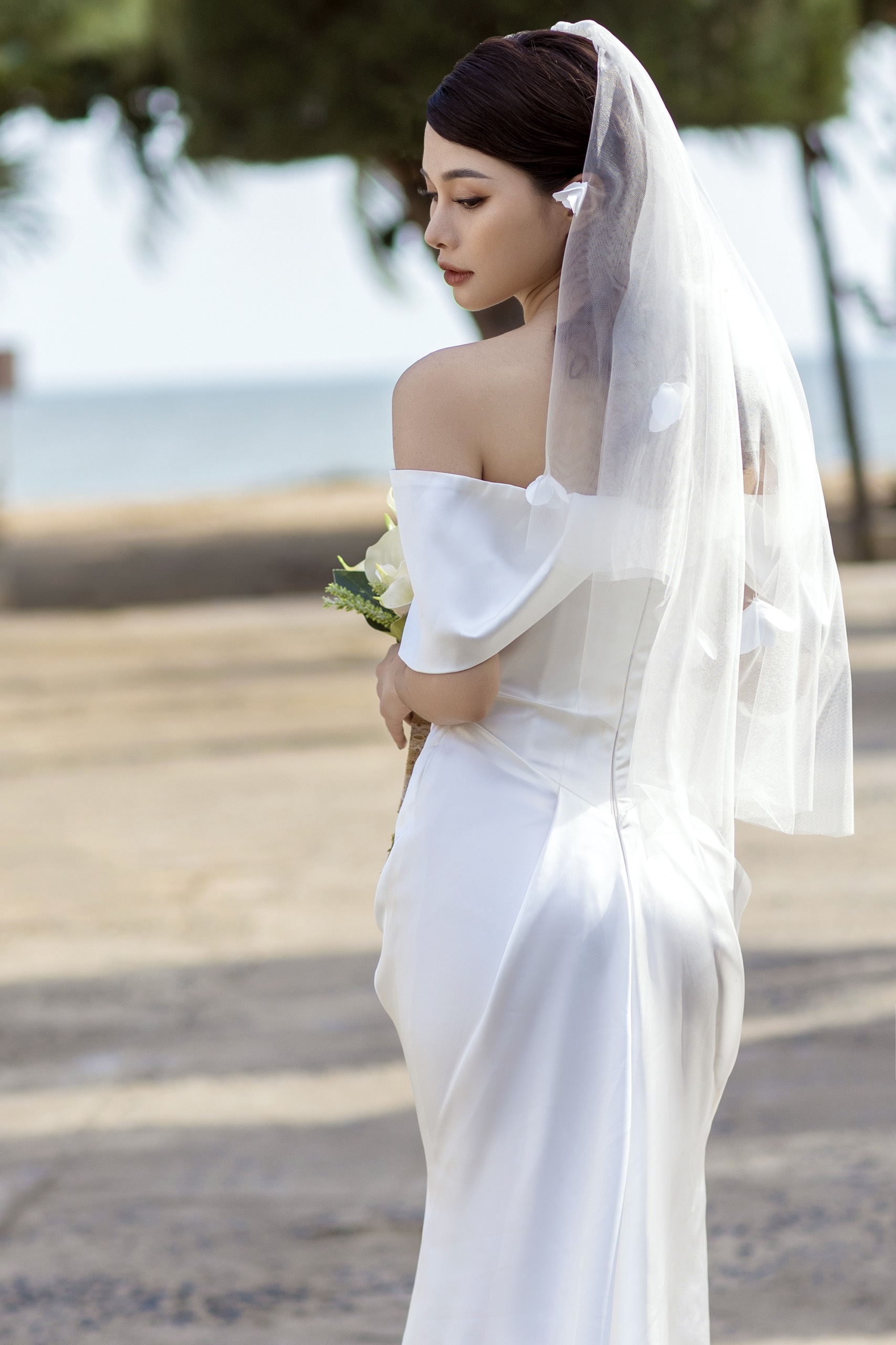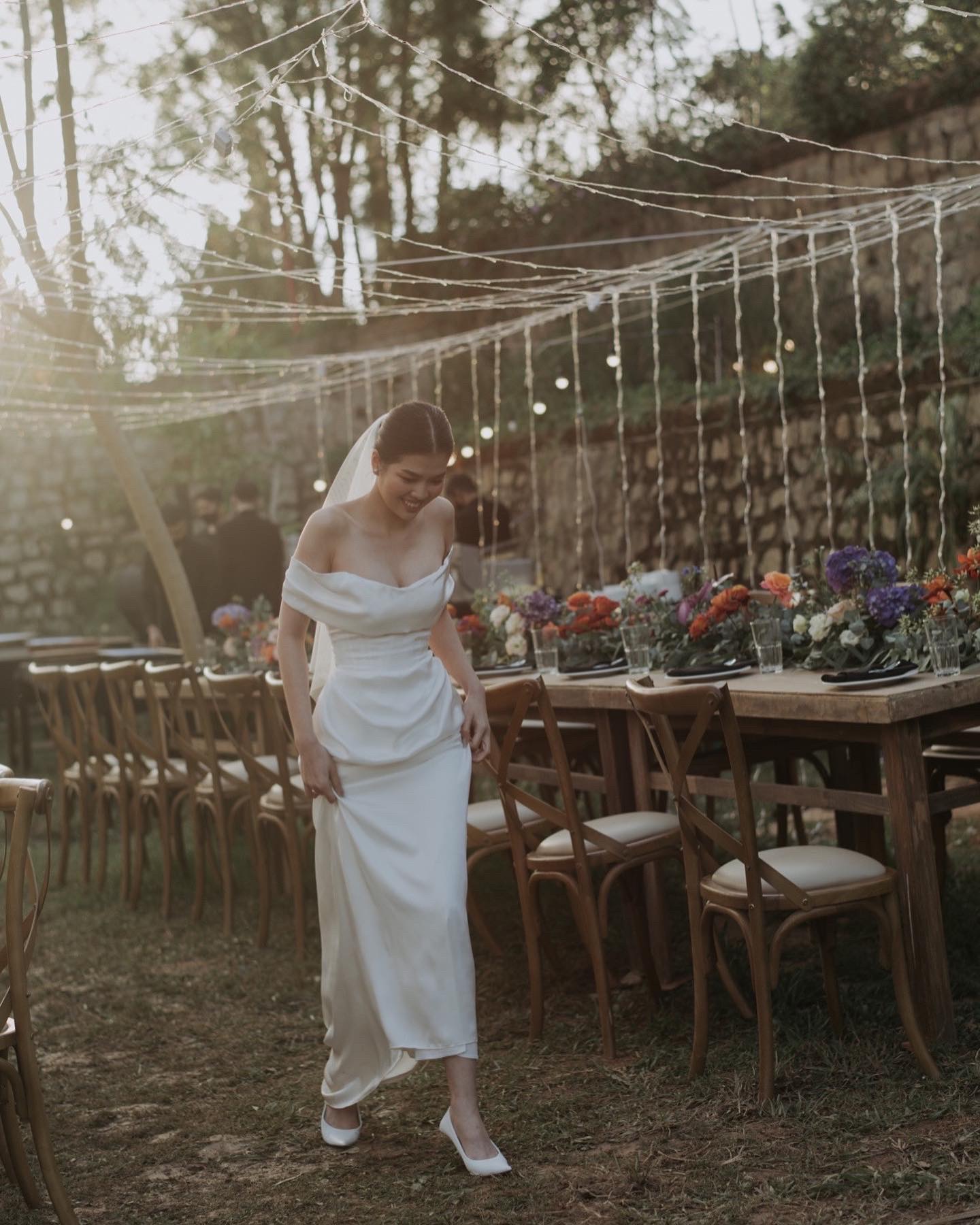 | Đặc điểm | – Thiết kế bẹt vai, đổ nhẹ– Tùng váy dáng đuôi cá ly đổ |
