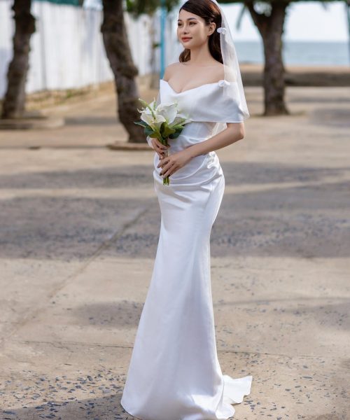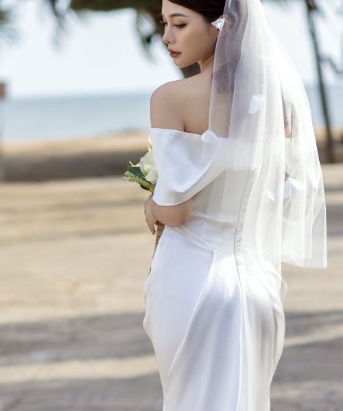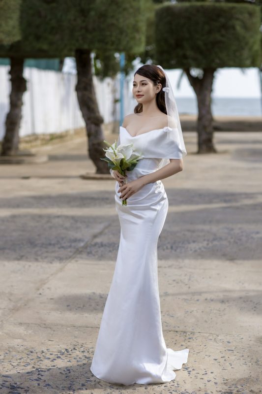 | Đặc điểm | – Thiết kế bẹt vai, đổ nhẹ– Tùng váy dáng đuôi cá ly đổ |