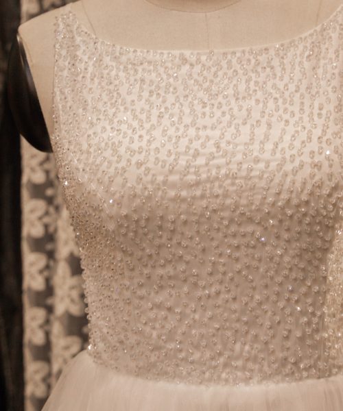 [OanhDesign] Chiếc váy cưới trắng đính cườm OAH 025 do NTK Kim Oanh sáng tạo. Phần ngực áo kết cườm tinh tế, phần lưng phối nút và đắp ren hoa.