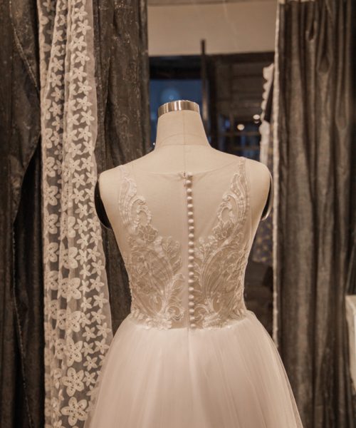 – Lưng áo phối nút và đắp ren hoa tinh tế – Cổ thuyền – Chân váy phồng |