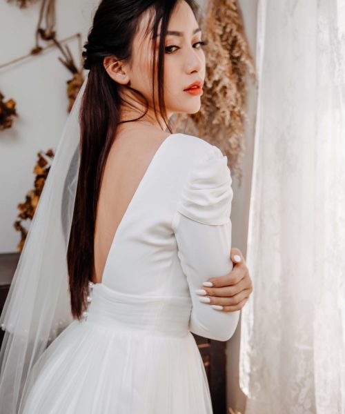 | Đặc điểm | – Tay áo dài ôm, phồng vai nhẹ, tinh tế– Lưng xẻ sâu, ngực V, eo váy phối nút